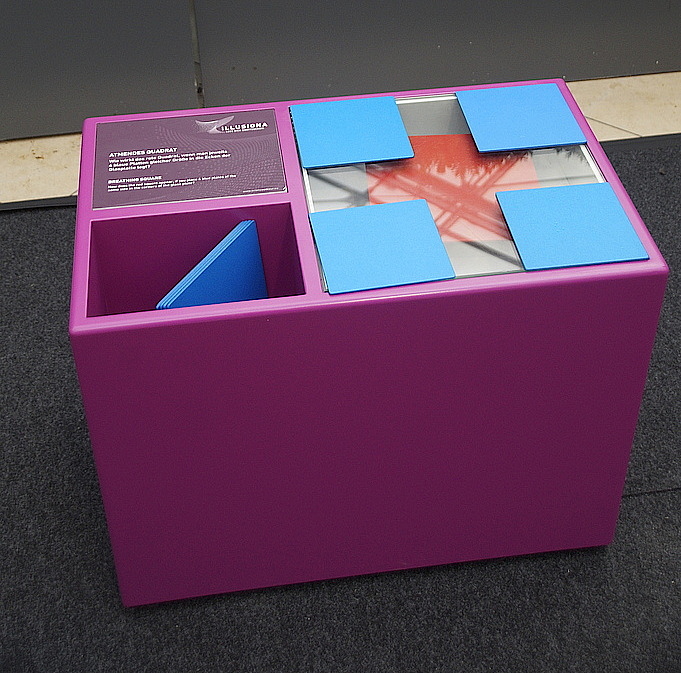 So verändert zum Beispiel farbiges Licht die Wahrnehmung weißer Flächen, ein ungewöhnlicher Rand erschwert die Größenschätzung eines rotierenden Quadrates und der schräge Boden der „Schiefen Hütte“ verwirrt Augen und Gleichgewichtssinn.