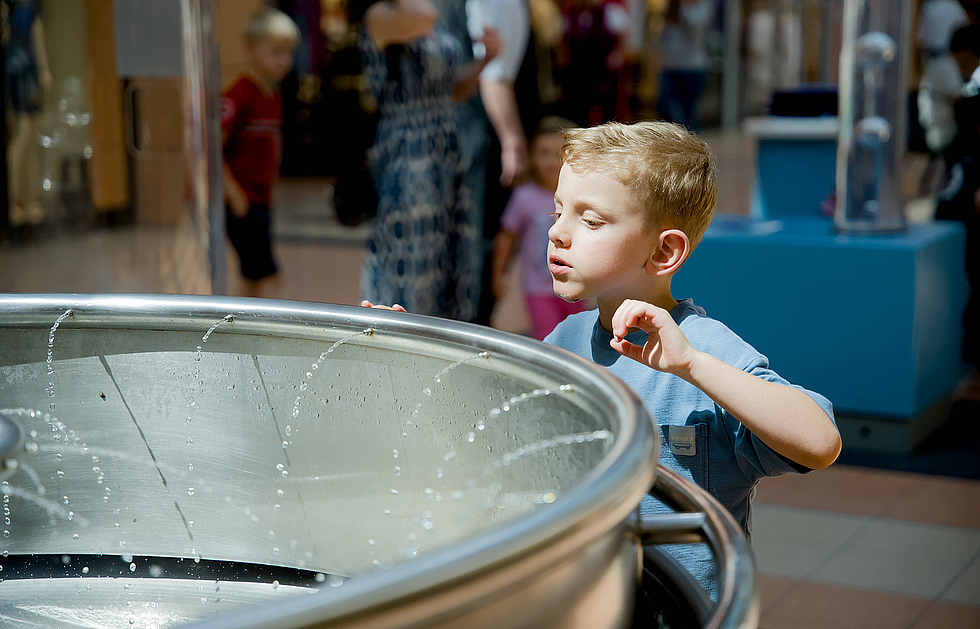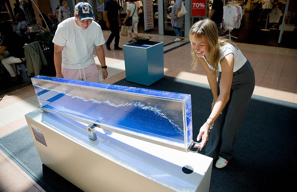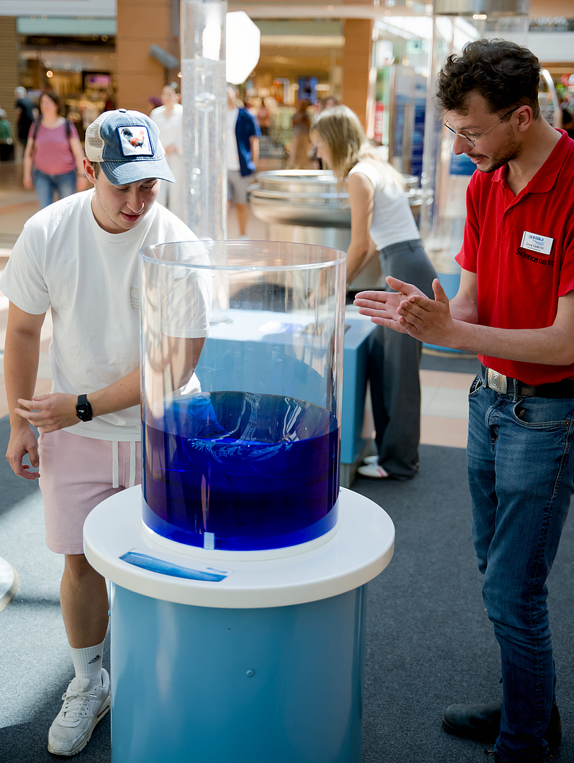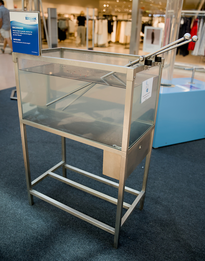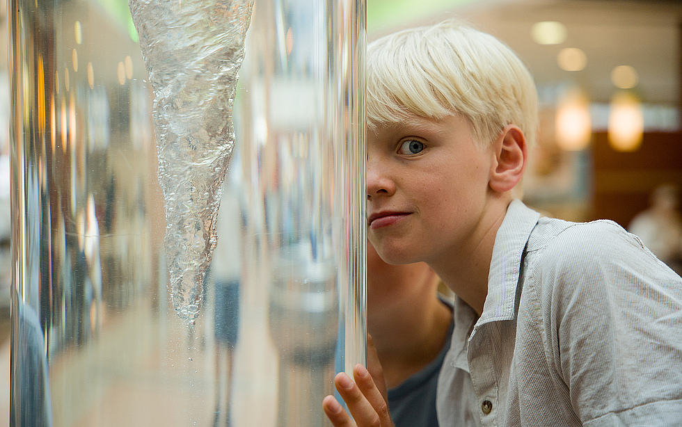 Es strömt, es bildet Muster es beeinflusst das Licht, es zeigt uns Kräfte an usw. Die Ausstellung lädt Menschen jeden Alters ein, Phänomene rund um das Thema Wasser selbst zu erkunden und Zusammenhänge zu erkennen.