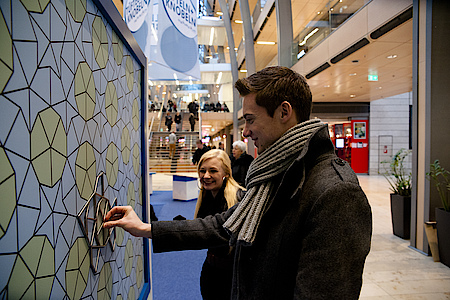 Ziel ist es, das Dreieck so zu drehen, dass sein Schatten genau auf eines der kleinen Dreiecke an der Wand passt.